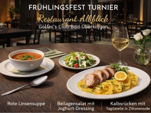 Freuen Sie sich auf einen sportlichen und geselligen Saisonauftakt inmitten eines echten Frühlingserwachens auf unserer Anlage. Nach dem Turnier verwöhnt Sie das Restaurant Albblick zunächst mit einer Suppe direkt nach der Runde, um den ersten Hunger zu stillen. Ab ca. 17.30 Uhr folgen Abendessen und Siegerehrung in gemütlicher Atmosphäre.